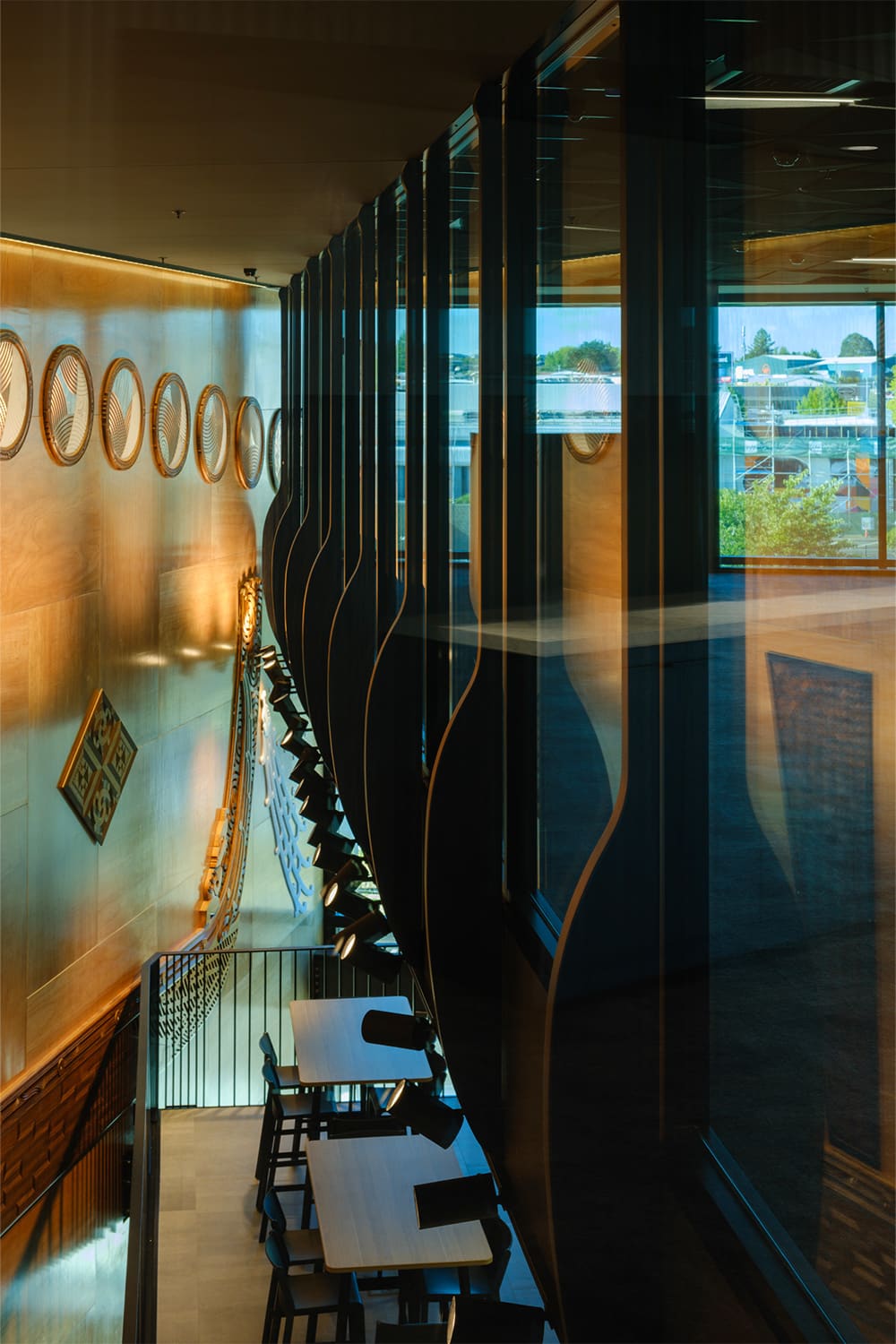 A monumental artwork wall inside the atrium, depicts Tūwharetoa mythologies and the celestial journey of Matariki.