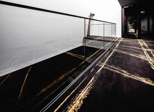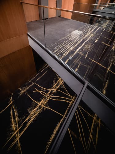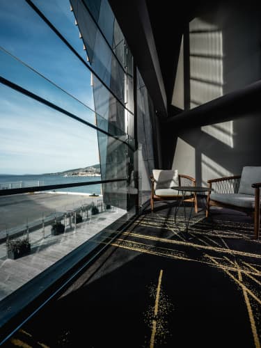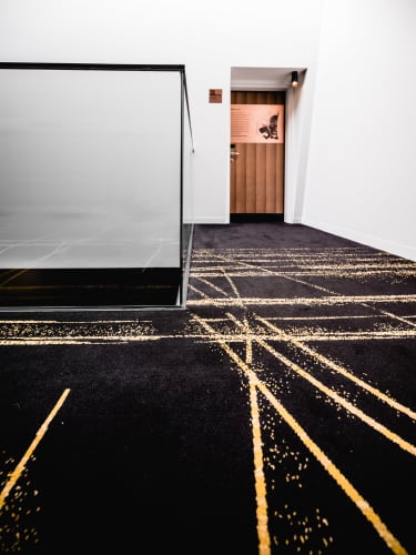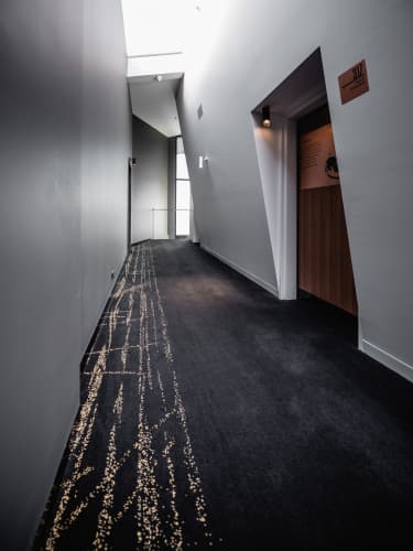 The long corridors of the MACq 01 feature a striking design, captured masterfully in the custom woven axminster carpet by Feltex. Whilst meeting the high quality, hard wearing requirements of a heavy traffic area, the carpet design also adhered to a discerning floorcovering brief with the inviting charcoal base providing the perfect platform for the sparkling gold highlight darting down each corridor.