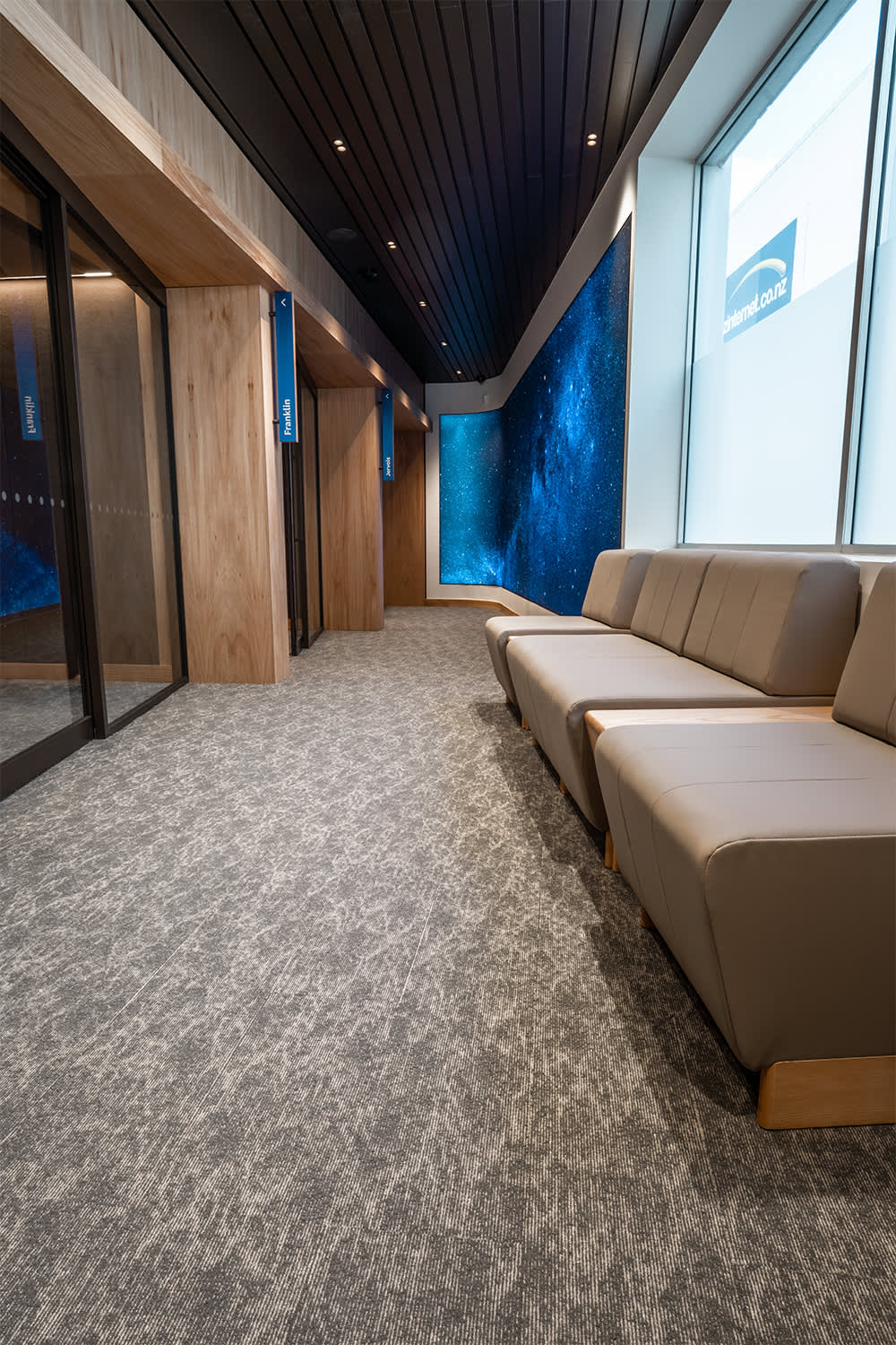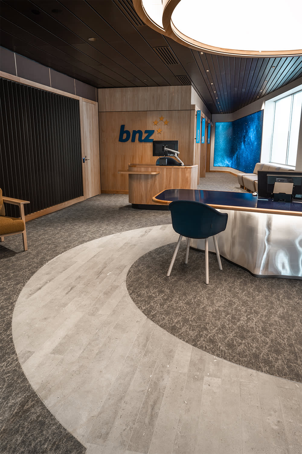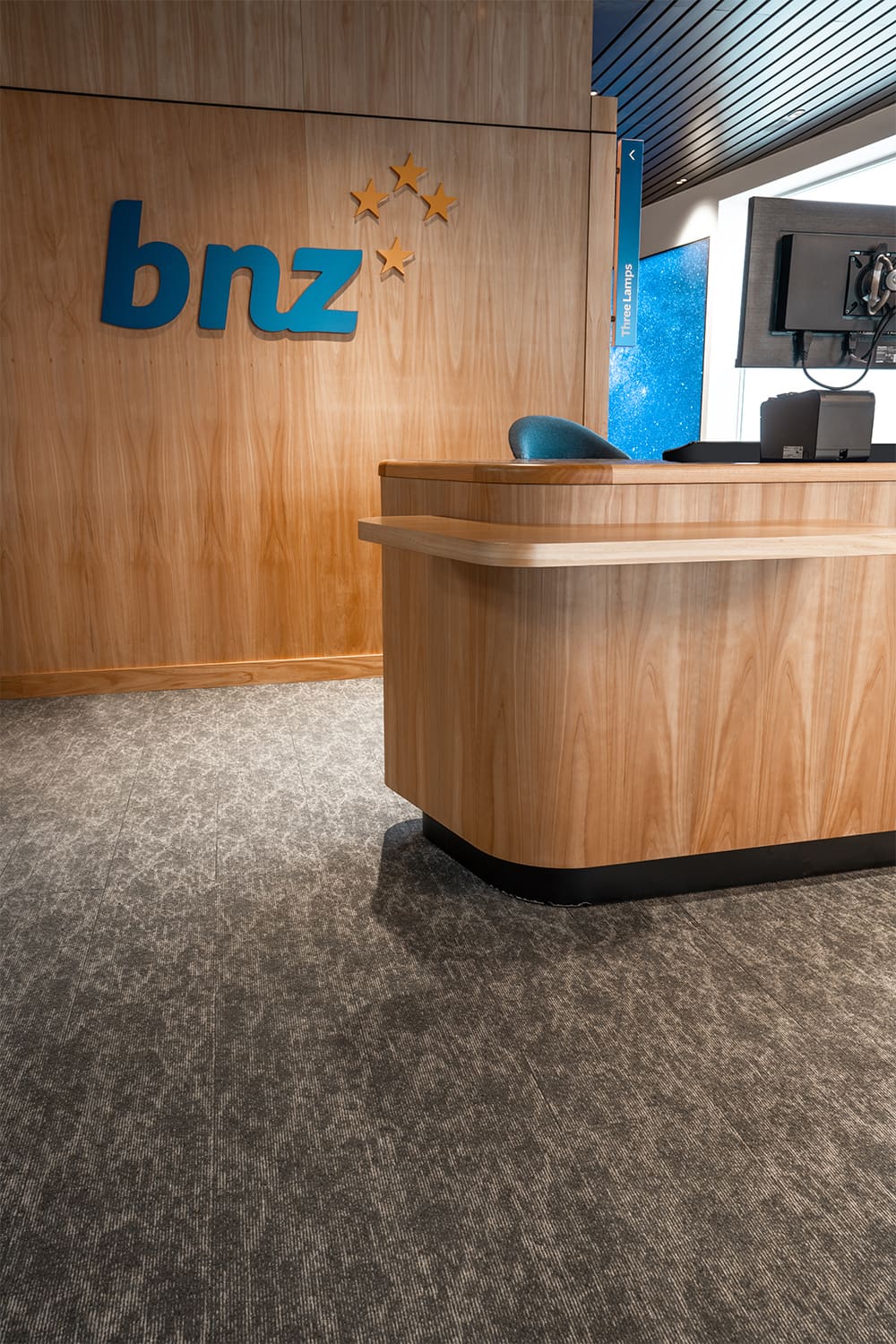 The project features a unique custom pattern and color palette developed by GH Commercial specifically for BNZ. This thoughtful design ensures a cohesive aesthetic across multiple branches while allowing for individual character tailored to the communities served by each location.