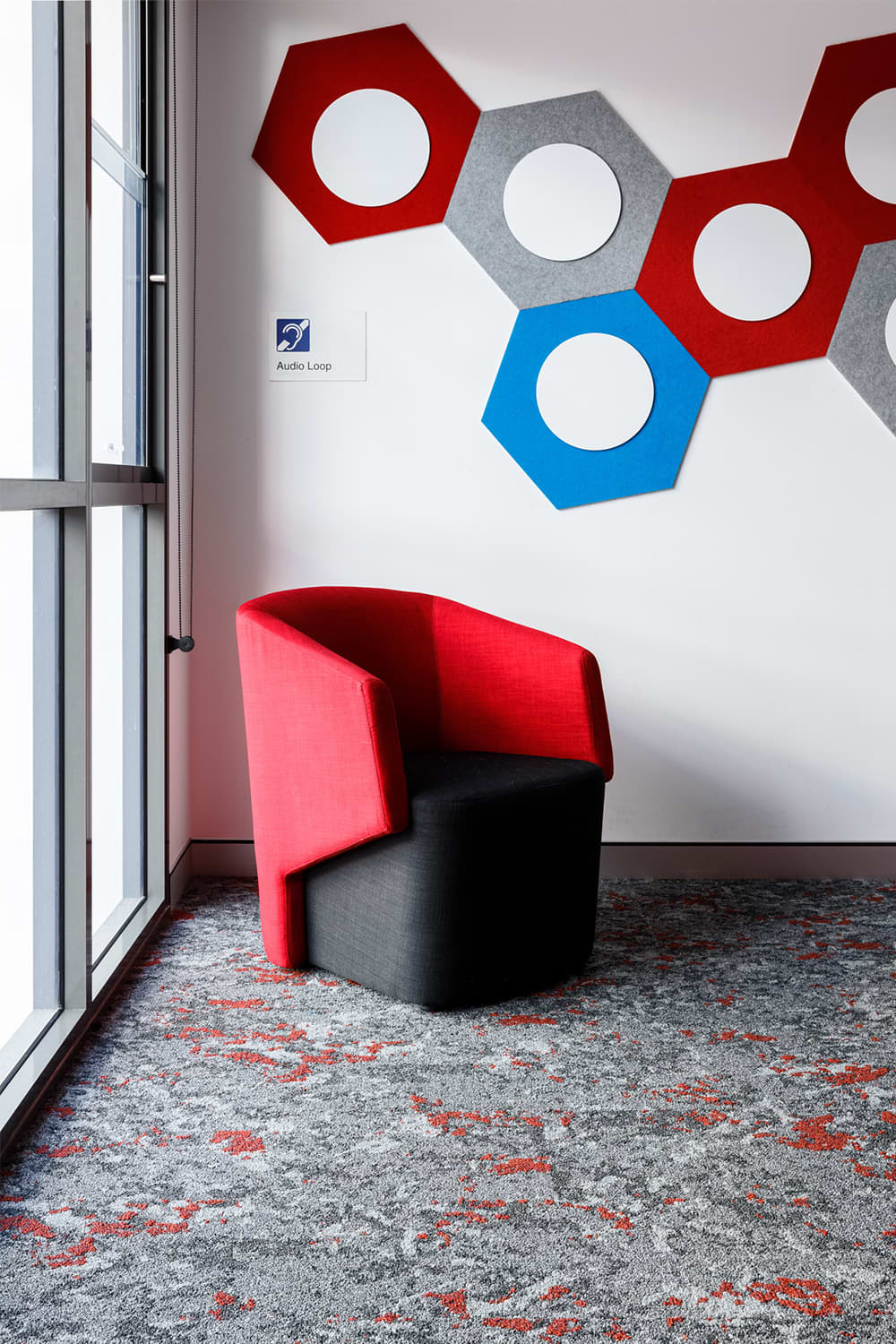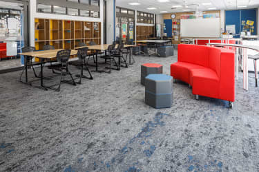 The Lichen 1.5 collection of carpet planks was an inspired choice for the updated flooring, creating a cohesive and connected aesthetic while also designating distinct learning spaces.