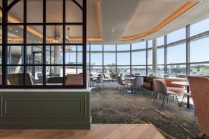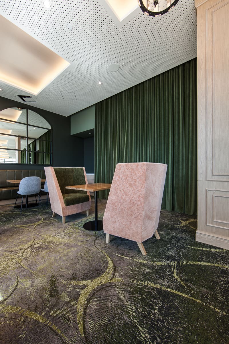 From the serene to the unexpected, the public lounge and bar features a daring Godfrey Hirst Designer Jet® carpet sharply paired with mint green and white furniture.