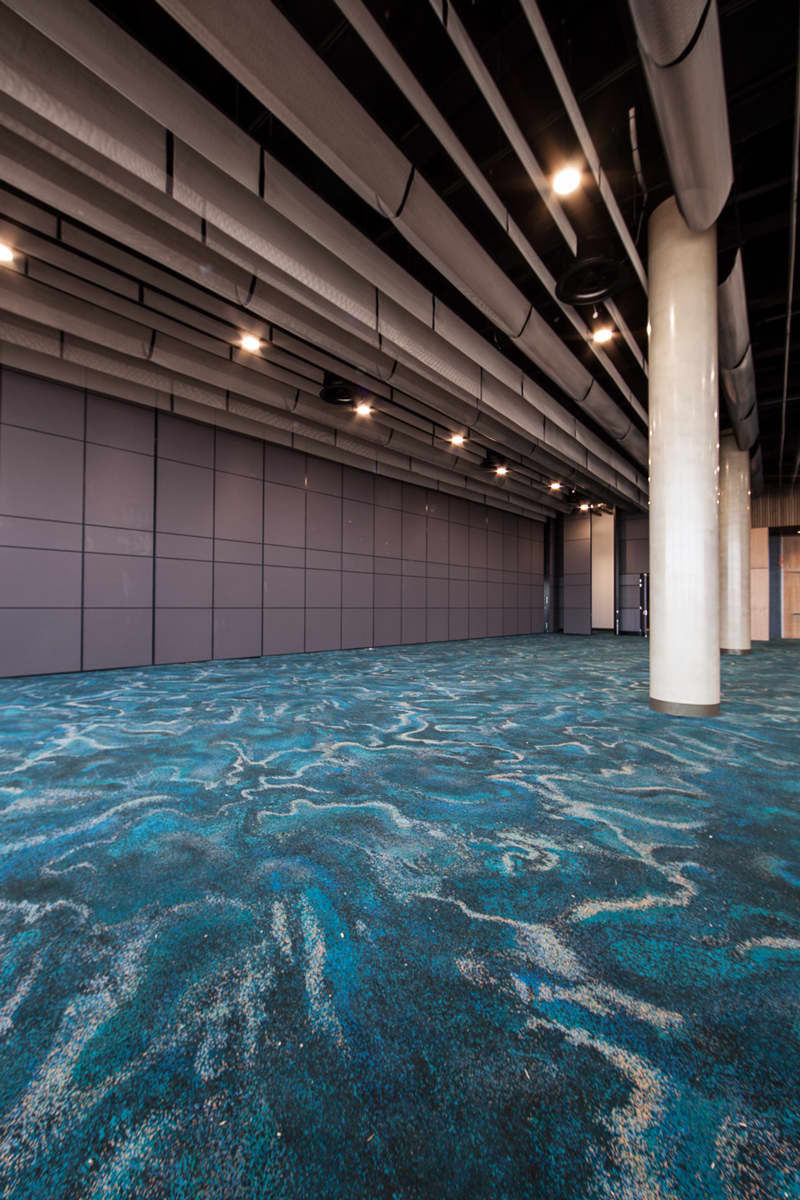 The stadium carpet showcases a number of striking carpet designs, perhaps none greater than the main function room, inspired by the Abrolhos Islands off the west coast of Australia. The Abrolhos is a chain of 122 islands and associated coral reefs in the Indian Ocean and its brightly coloured organic features were captured masterfully in the finished woven carpet design.