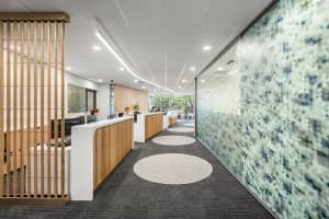 A deceptively simple Nordic aesthetic, characterised by the liberal use of pale timber walls, panelled desks and room dividing screens, along with clean white surfaces and feature window glazing, was stunningly off-set by two complementary flooring products creatively laid for strong visual appeal.