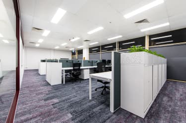 By using two colours of the Metrics range, work zones and pathways have been created to add dimension and added interest to this work space.